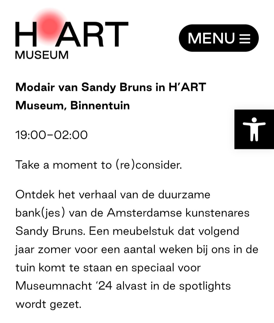 After the 2024 ´Momentum´ fashion show of Tess van Zalinge the seats has been used at NockNock art fair, C The Future at Haarlem’s innovative Maak terrein and at H´art Museum during Museumnacht. Another collaboration with H´art Museum will follow mid 2025, highlighting the essence of the project; rejection transformed into a positive message of acceptance and the right to exist.
